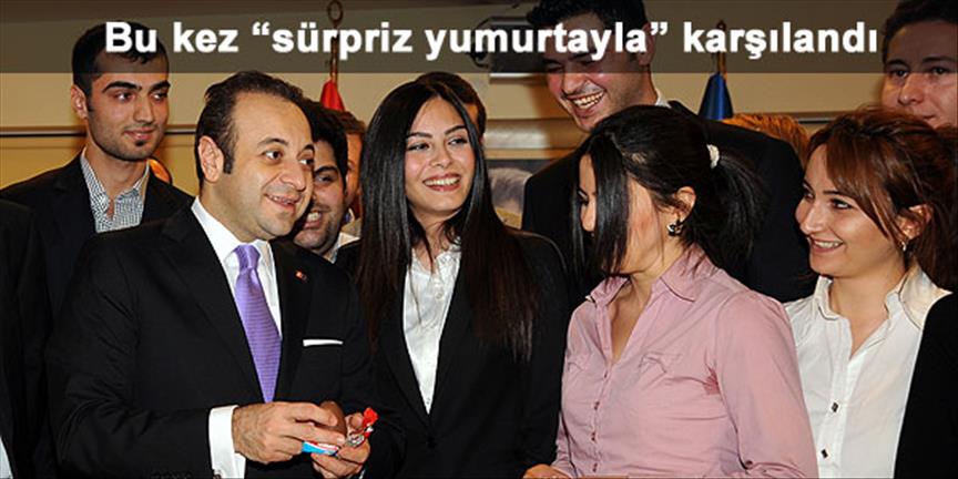Çankaya Üniversitesi öğrencileri, AB Bakanı ve Başmüzakereci Egemen Bağış'a ''sürpriz yumurta'' hediye etti.***