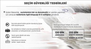 AA muhabirinin İçişleri Bakanlığı yetkililerinden aldığı bilgiye göre, seçim güvenliği için bütün kolluk kuvvetlerinin izinleri iptal edildi, zorunlu haller dışında tamamı görev başına çağrıldı.
