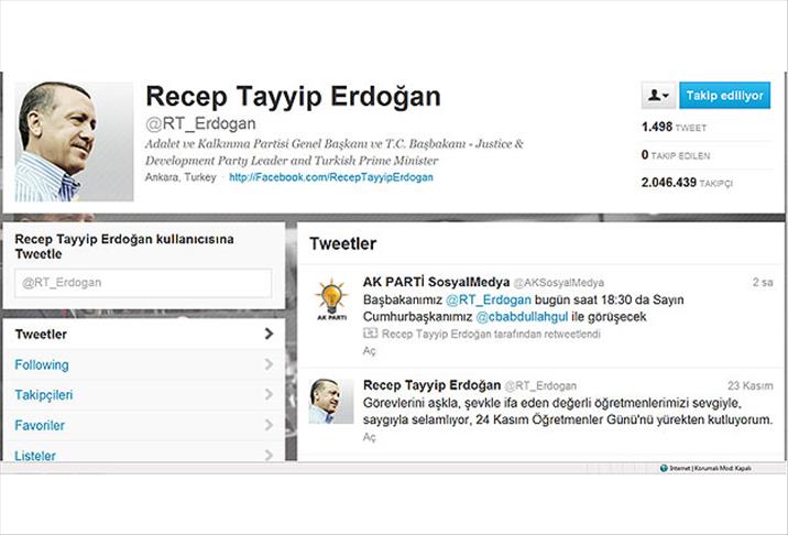 Başbakan Recep Tayyip Erdoğan, twitter'ı düzenli kullanan siyasetçilerin başında geliyor. Bugüne kadar attığı tweet sayısı bin 498. Takipçi sayısı ise 2 milyon 46 bin 383. Başbakan, en çok takip edilen siyasetçi listesinde ilk sırada yer alıyor.