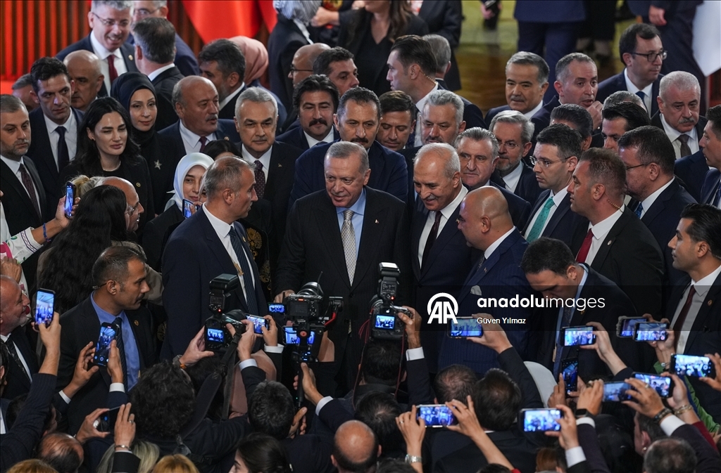 TBMM Tören Salonu'ndaki resepsiyona, Cumhurbaşkanı Recep Tayyip Erdoğan, Cumhurbaşkanı Yardımcısı Cevdet Yılmaz, Adalet Bakanı Yılmaz Tunç, İçişleri Bakanı Ali Yerlikaya, Sağlık Bakanı Kemal Memişoğlu, Gençlik ve Spor Bakanı Osman Aşkın Bak, AK Parti Grup Başkanı Abdullah Güler, MHP Genel Başkanı Devlet Bahçeli, DEM Parti Eş Genel başkanları Tuncer Bakırhan ve Tülay Hatimoğulları, Gelecek Partisi Genel Başkanı Ahmet Davutoğlu, DEVA Partisi Genel Başkanı Ali Babacan, Saadet Partisi Genel Başkanı Mahmut Arıkan, Yeniden Refah Partisi Genel Başkanı Fatih Erbakan, HÜDA PAR Genel Başkanı Zekeriya Yapıcıoğlu, BBP Genel Başkanı Mustafa Destici, Cumhurbaşkanlığı İletişim Başkanı Burhanettin Duran, partilerin grup başkanvekilleri, milletvekilleri, bürokratlar, yabancı misyon temsilcileri, sivil toplum kuruluşu temsilcileri, sanatçılar ile çok sayıda davetli katıldı.