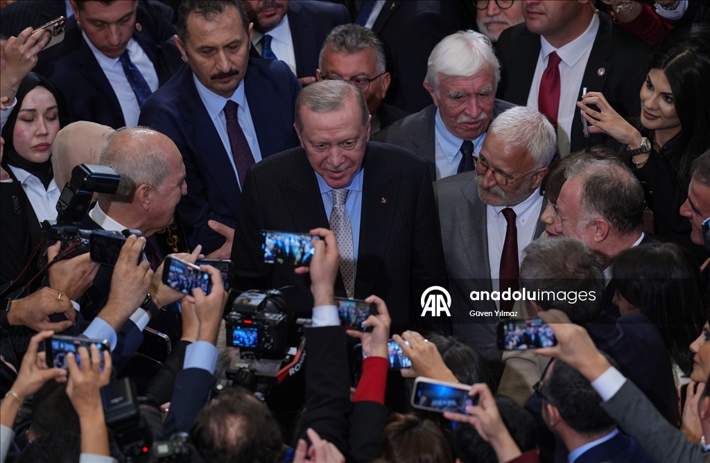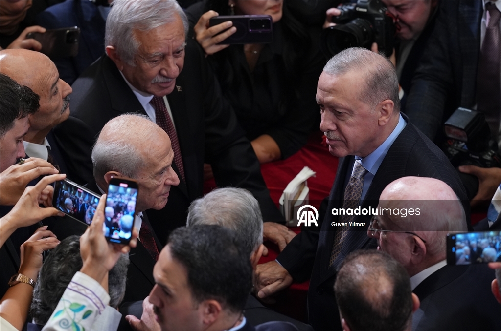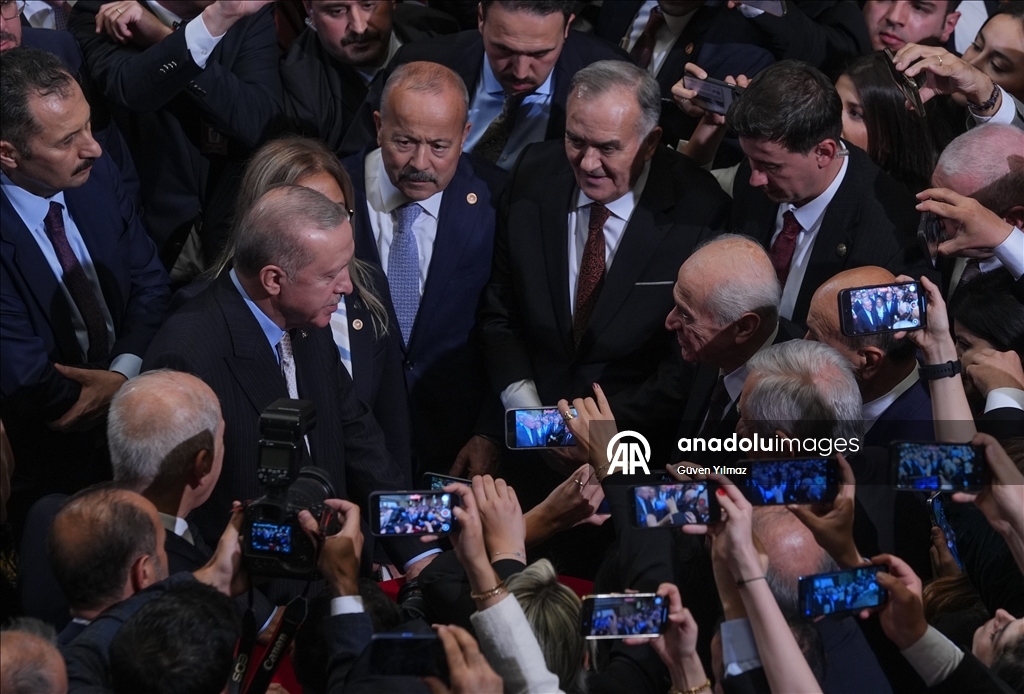 Cumhurbaşkanı Erdoğan, MHP Genel Başkanı Bahçeli'nin ve MHP'li milletvekillerinin bulunduğu, DEM Parti Eş Genel başkanları Bakırhan ve Hatimoğulları ile DEM Parti'li milletvekillerinin olduğu masaları ayrı ayrı ziyaret etti.