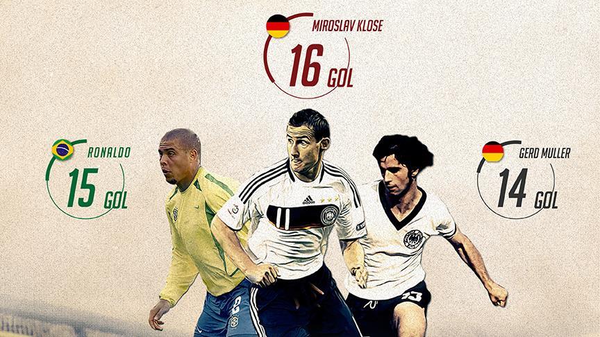 Klose'yi 15 golle Brezilyalı Ronaldo izlerken, Alman futbolcu Gerd Müller 14, Fransız Just Fontaine 13 gol, Brezilya ve dünya futbolunun en büyük ismi olarak kabul edilen Pele ise 12 golle bu futbolcuları takip ediyor.