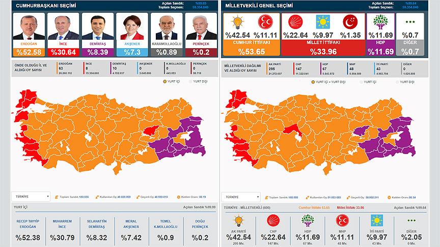 YSK'nin açıkladığı kesin olmayan sonuçlar da AA'nın kamuoyuna aktardığı sonuçların doğruluğunu tescilledi. AA, YSK'nin açıkladığı verilerle birebir örtüşen sonuçlarıyla, yüzde 100 doğruluk oranını yakaladı.
