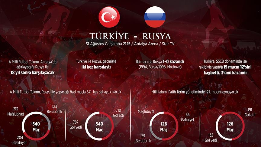 Öte yandan Türkiye, Rusya ile karşı karşıya geleceği 31 Ağustos'ta geçmişte iki maç oynadı. 1994'te özel maçta Makedonya'yı 2-0 yenen milliler, 1996'da ise Dünya Kupası Avrupa Elemeleri'nde Belçika’ya 2-1 kaybetti.