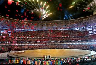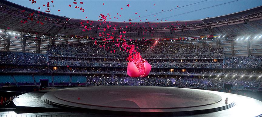 Azerbaycan kültür ve tarihini yansıtan, geleneksel minyatür sanatının ve sembollerin kullanıldığı havai fişek, koreografi ve ışık gösterileriyle süren törenin devamında oyunlarda yarışacak sporcular, ülkelerinin bayraklarıyla stada girdi.