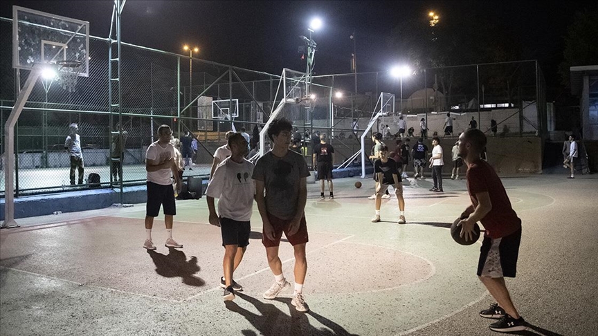 Akşam havanın biraz daha serinlemesiyle arkadaşlarıyla basketbol oynayan öğrenciler, tatili spor yaparak değerlendiriyor.