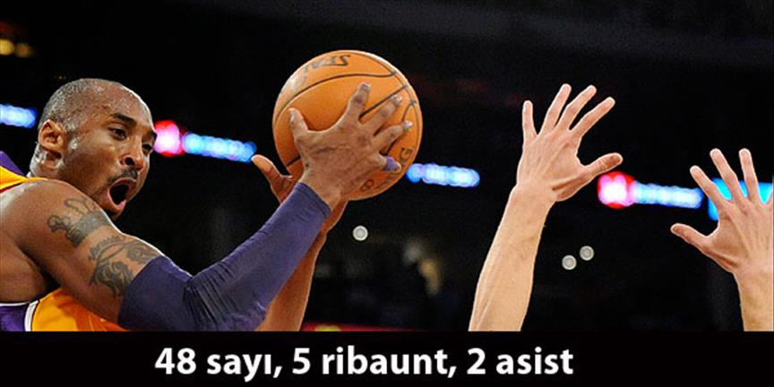 Los Angeles Lakers'da Kobe Bryant, takımının Phoenix Suns'ı 99-83 yendiği maçta 48 sayı attı. Karşılaşmayı 48 sayı, 5 ribaunt 2 asistle tamamlayan 33 yaşındaki Bryant, geçen mart ayından beri 40 sayıyı geçemediğini belirterek, ''bir ihtiyar için fena değil'' ifadesini kullandı.