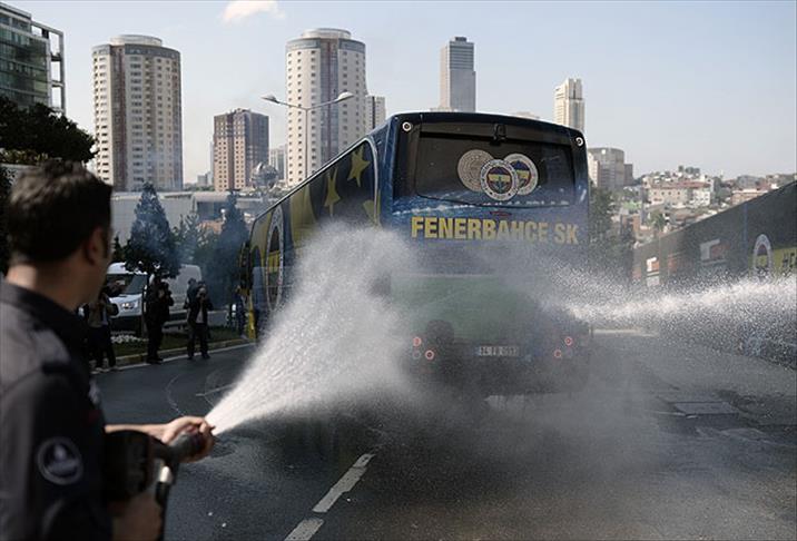 Takım otobüsü salondan ayrılırken çıkışta bulunan taraftarlar, sarı ve lacivert renklerdeki kovalarla kafilenin arkasından su döktüler. Otobüsün üzerine, güvenlik çıkışından sonra da salon dışında bulundurulan itfaiye aracından su sıkıldı. Kafileyi taşıyan otobüs motorlu polis eskortuyla havalimanına gitti.