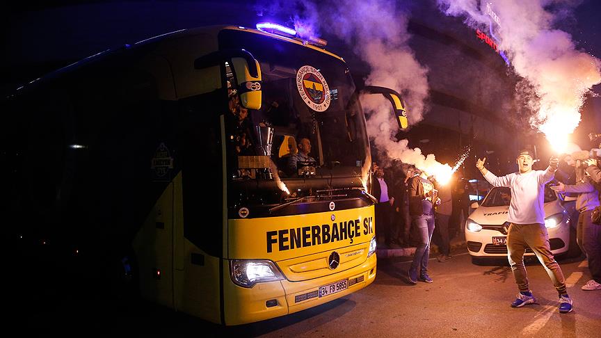 Sarı-lacivertli taraftarlar takım otobüsüne kendi araçlarıyla eşlik etti. Otobüsün en önünde dün kazanılan THY Avrupa Ligi kupası yer aldı.