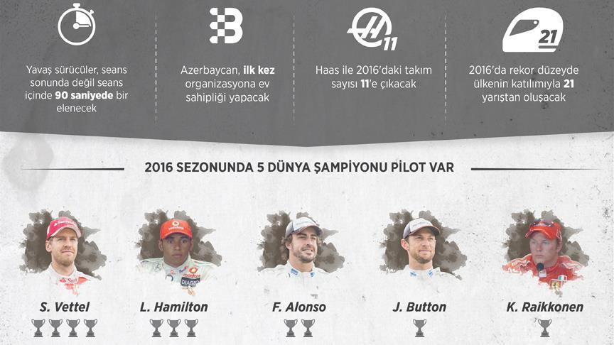 Formula 1'de 2016 sezonuna yeni bir pist eklendi ve Avrupa Grand Prix'si takvime alındı. Azerbaycan'ın başkenti Bakü'de düzenlenecek sezonun 8. yarışı 17-19 Haziran'da koşulacak.Geçen yıl iptal edilen Almanya Grand Prix'si bu sezon yeniden takvime dahil edildi. Sezonun 12. yarışı Almanya Grand Prix'sine Hockenheim'daki pist ev sahipliği yapacak.