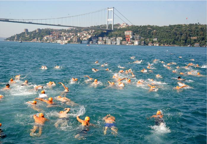 Kanlıca Vapur İskelesi'nden suya atlayan sporcular, yaklaşık 6.5 kilometrelik parkuru yüzerek, Kuruçeşme Cemil Topuzlu Parkı'nda yarışı bitirdi.