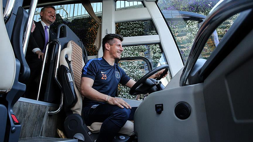 Gümüşdağ, teknik direktör Avcı ve futbolcular, törende yeni otobüsü inceledi. Medipol Başakşehir'in kaptanı Emre, basın mensuplarına direksiyon başında poz verdi.