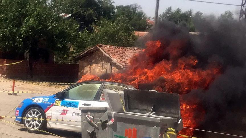 Avrupa Ralli Kupası kapsamındaki Balkan Ralli Kupası'nın 4. yarışı Troia Rally'de yarışan milli sporcu Burcu Çetinkaya Bucak'ın kullandığı araç yandı.
