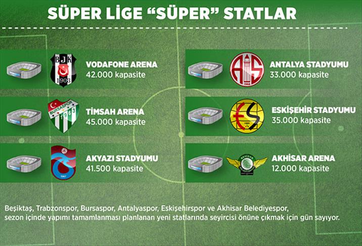 Beşiktaş, Trabzonspor, Bursaspor, Antalyaspor, Eskişehirspor ve Akhisar Belediyespor, sezon içinde yapımı tamamlanması planlanan yeni statlarında seyircisi önüne çıkmak için gün sayıyor, Ankara, Gaziantep ve Sivas'taki yeni statların inşaatları ise sürüyor.