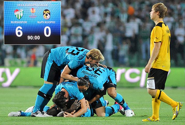 Finlandiya'da yapılan ilk maçı 1-0 kaybeden Bursaspor rövanşı 6-0 kazanarak UEFA Avrupa Ligi play-off grubuna yükseldi.