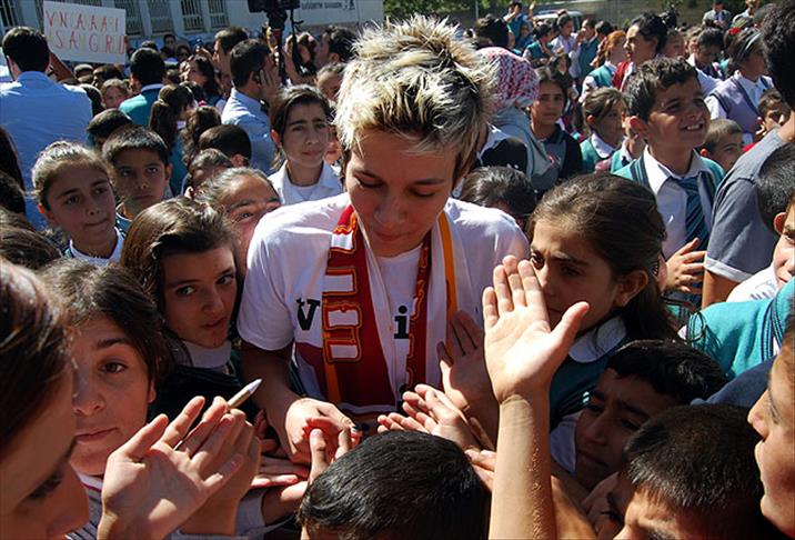 Burada, çocukların büyük ilgisiyle karşılaşan sarı-kırmızılı sporcular, öğrencilerle fotoğraf çektirdi ve imza dağıttı.