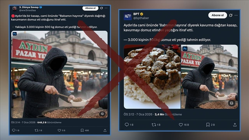 ABD merkezli sosyal medya platformu X'te yayılan iddiaya göre Aydın'da bir cami önünde hayır amaçlı domuz eti dağıtıldı. Sosyal medyada eksik bilgiyle güncel bir haber gibi paylaşılan iddia yoğun etkileşim yarattı. 7 Ocak 2026 tarihinde "Aydın'da cami önünde 'Babamın hayrına' diyerek kavurma dağıtan kasap, kavurmayı domuz etinden yaptığını itiraf etti. 3 bin kişinin 500 kilo domuz eti yediği tahmin ediliyor." ifadesiyle yapılan paylaşım 3 milyondan fazla görüntülenme aldı.