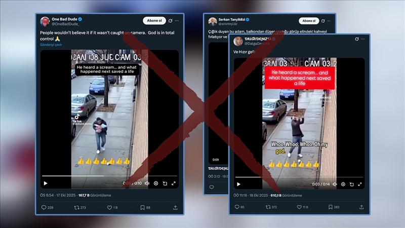 Kaldırımda yürüyen bir adamın binadan düşen bebeği kurtardığı anları gösteren güvenlik kamerası görüntüsü, ABD merkezli X ve Instagram uygulamalarında gündem oldu. Yabancı kaynaklar tarafından paylaşılan görüntü, Türkiye'de de çok sayıda X kullanıcısı tarafından benzer ifadelere yer verilerek paylaşıldı.