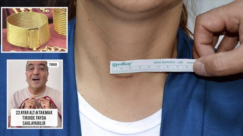 Videoda boyuna 22 ayar altın bağlamanın tiroide fayda sağlayabileceği öne sürülüyor.