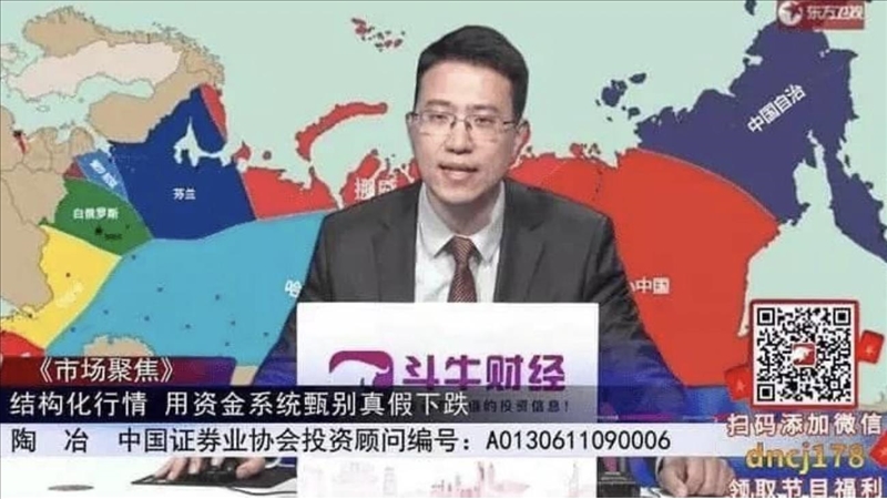 Teyit Hattı, görüntüdeki yazıların ne anlama geldiğini ve yayının içeriğini öğrenmek için AA Çin Muhabiri Emre Aytekin ile iletişime geçti. Arka planda Rusya topraklarının bölüşüldüğünü gösterdiği iddia edilen harita bulunsa da ekranda Rusya’yla ilgili herhangi bir yazı bulunmuyor. Görüntüdeki bordo şeritte “piyasa odağı” yazıyor. Siyah şeritte “yeni yapılandırılan piyasa sermayesi sistemi yatırımlarından bahsediliyor. En alt kısımdaki beyaz şeritte ise sunucunun yatırım danışmanı olduğu şirketin adı ve sicil numarası yer alıyor.