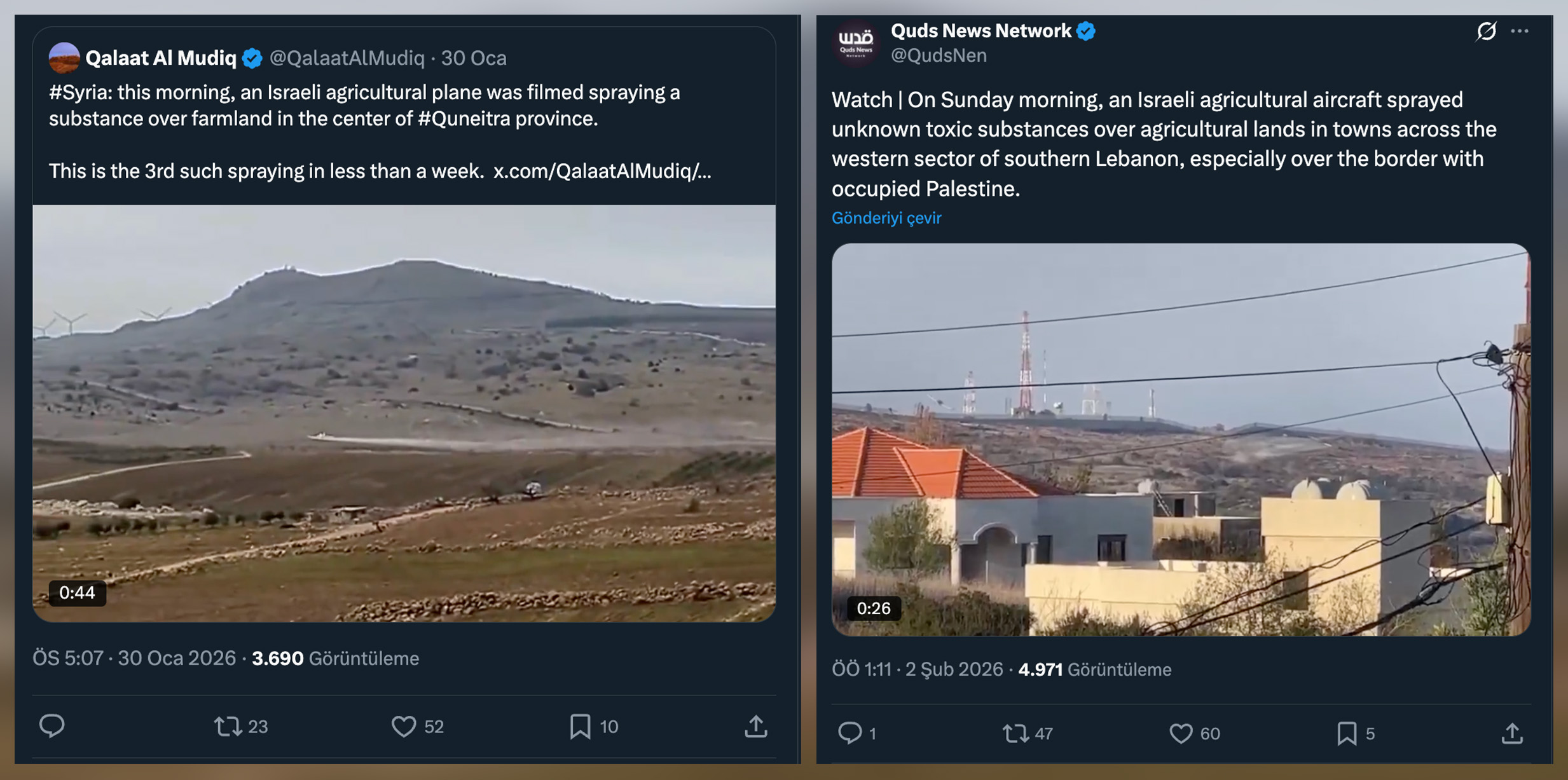 İsrail uçaklarının Lübnan-Suriye sınırına kimyasal sıvı püskürttüğü iddia edilen görüntüler, ABD merkezli sosyal medya platformu X'te gündem oldu. Videolarda, traktör uçakların düşük irtifada kırsal alan üzerinde uçuşları yaptıkları görüntülendi.