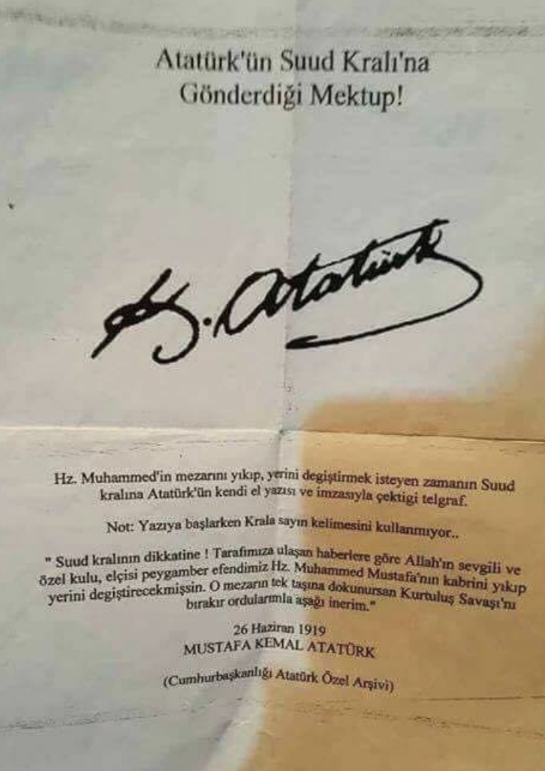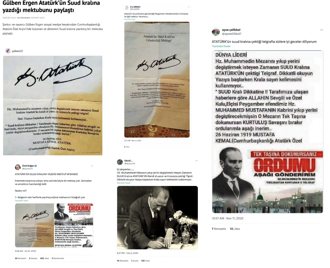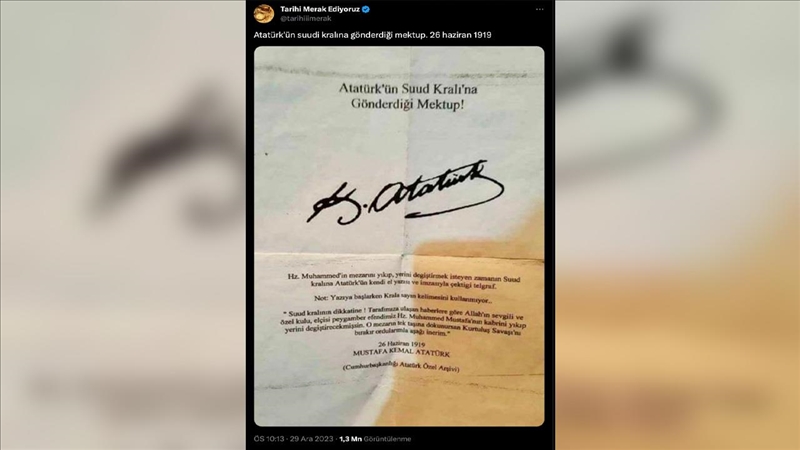 Türkiye Cumhuriyeti'nin kurucusu Gazi Mustafa Kemal Atatürk'ün, Suud kralına yazdığı iddia edilen mektup (kimi paylaşımlara göre telgraf) fotoğrafı, internette sıklıkla dolaşıma sokuluyor. Dün akşam saatlerinde Suudi Arabistan'ın başkenti Riyad'da yapılması planlanan 2023 Turkcell Kupa maçının iptal edilmesi sonrası aynı görsel yeniden gündem oldu.