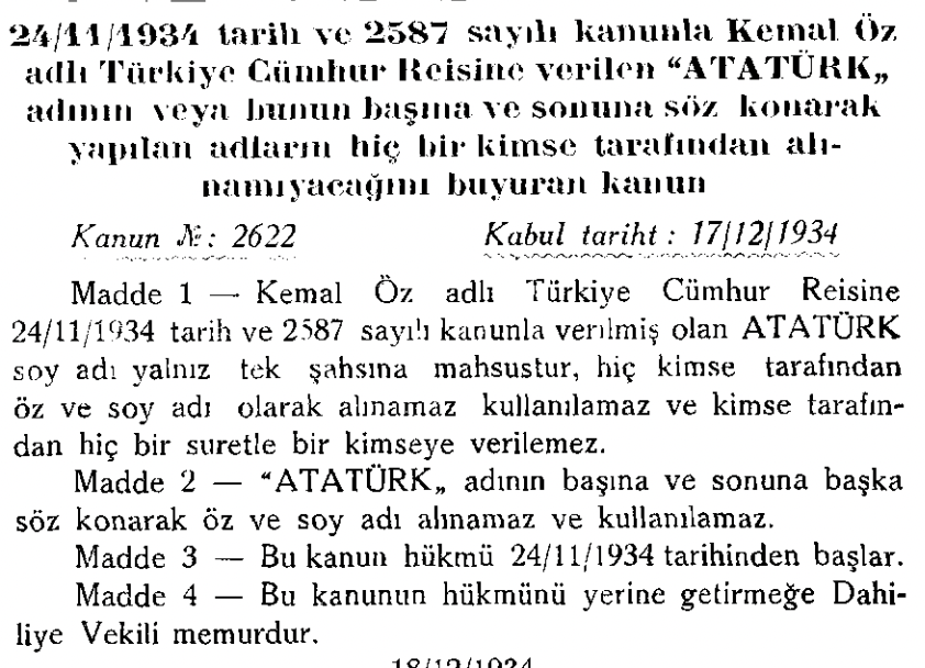 - 2587 sayılı kanunla Mustafa Kemal'e Atatürk soyadı 1934'te verildi.