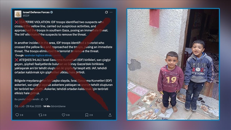 İsrail ordusu, 29 Aralık tarihinde ABD merkezli X hesabından yaptığı bir paylaşımda, ateşkesi ihlal ettiği gerekçesiyle Gazze Şeridi'nde iki şüphelinin etkisiz hale getirildiğini bildirdi. Açıklamada şu ifadeler yer aldı: