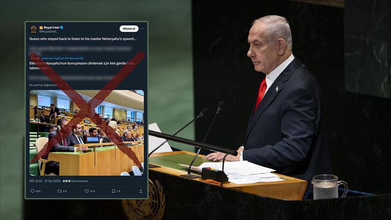 ABD merkezli sosyal medya uygulaması X'te yapılan ve 600 binden fazla görüntülenme alan bir paylaşım gündem oldu. İçerikte Suriye Cumhurbaşkanı Ahmed Şara'nın Birleşmiş Milletler Genel Kurulu'nda oturduğu anları gösteren bir fotoğraf görüldü. Şara'nın Netanyahu'yu dinlemek için salonu terk etmediği öne sürüldü.