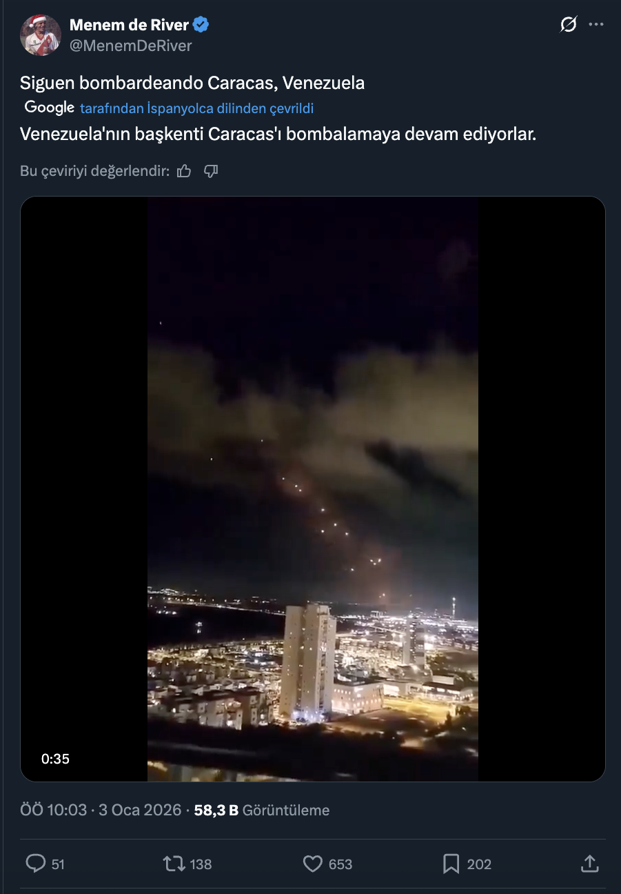 Venezuela'nın başkenti Caracas'taki saldırının ardından, ABD merkezli sosyal medya platformu X üzerinde olay anına ait olduğu iddia edilen çok sayıda görüntü yayılmaya başladı. Venezuela'da kaydedildiği öne sürülen bir videoda, çok sayıda füzenin sıralı olarak yerleşim bölgelerine isabet ettiği görüldü.