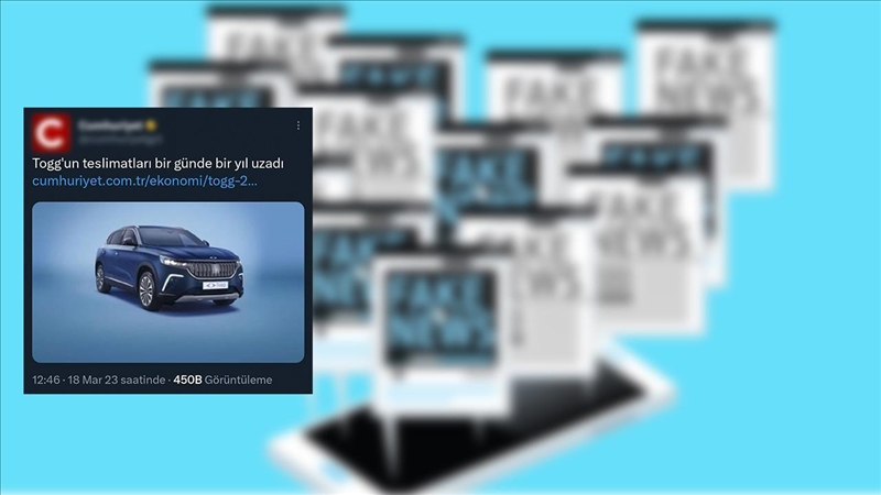 Yukarıda görseli görünen haber yanıltıcı başlık kavramına verilebilecek örnekler arasında yer alıyor. Haberde, Türkiye'nin yerli üretim otomobili TOGG'a gösterilen ilgi nedeniyle yaşanan yoğunluk anlatılıyor. Her yıl 20 bin araç üreteceği açıklanan TOGG'un 24 saatte ön sipariş almasına değinilirken, olumlu bir durum olarak görülebilecek bu duruma "Üretim tarihi bir yıl uzadı" başlığı atılmış. Tweet kısa süre içerisinde yüz binlerce görüntülenme ve binlerce etkileşim alırken, bazı sosyal medya kullanıcıları haberi başlıkta okudukları halde yanlış bilgiyle paylaştı, bazıları ise hakaret içeren yorumlar yazdı.