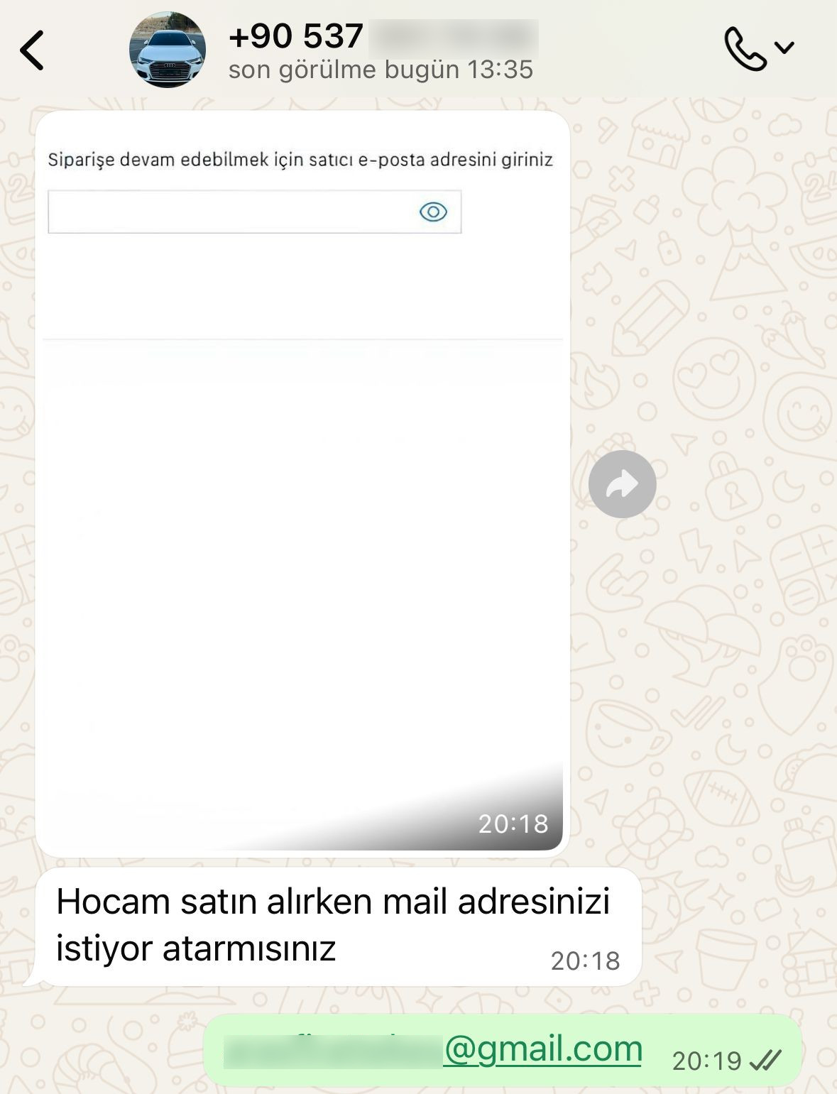 İlan sitesindeki satıcı, ürünle ilgilendiğini söyleyen birinden mesaj veya arama alıyor. Dolandırıcı, ürünü 'güvenli satış sistemi' üzerinden satın alacağını söyleyerek güven kazanıyor. İşlemin devam edebilmesi için e-posta adresine ihtiyaç duyduğunu söylüyor.