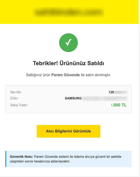 Sonraki aşamada satıcı, popüler ilan sitelerinin kurumsal kimliğini ve tasarımını taklit eden ve ürünün satıldığını belirten sahte bir e-posta alıyor.