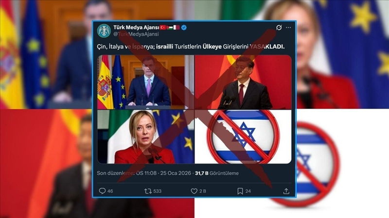 ABD merkezli X şirketinin sosyal medya platformunda Çin, İtalya ve İspanya'nın, İsrailli turistlerin ülkeye girişini yasakladığı iddia edildi. Benzer iddialar farklı platformlarda da dolaşıma sokuldu.