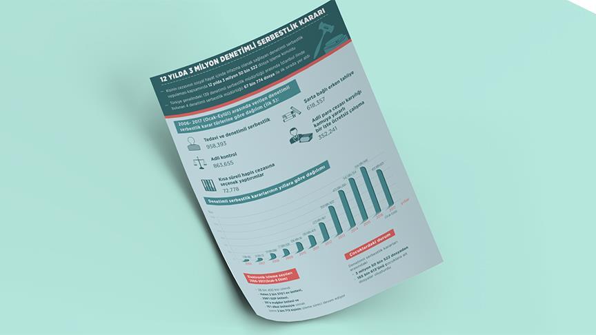 Buna göre, 2006'da 7 bin 185 karar verilmişken; 2007'de 21 bin 72, 2008'de 57 bin 886, 2009'da 77 bin 928, 2010'da 106 bin 18, 2011'de 130 bin 405, 2012'de 223 bin 967, 2013'te 359 bin 903, 2014'te 473 bin 266, 2015'te ise 542 bin 354 denetimli serbestlik kararı alındı.