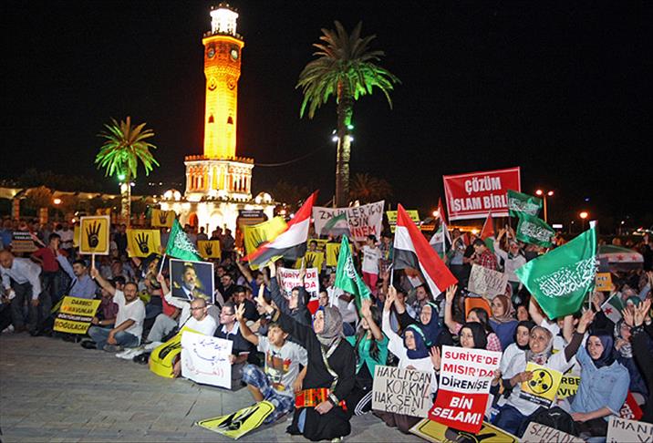 Konak Meydanı'ndaki Yalı Camisi önünde "Suriye ve Mısır Halkıyla Dayanışma Platformu"nun organize ettiği gösterilere çeşitli sivil toplum kuruluşları üyeleri katıldı. Kuran-ı Kerim'in okunmasıyla başlayan protestoda, katılımcılar Muhammed Mursi ve gösterilerde ölen İhvan Hareketi Lideri Muhammed el Biltaci'nin kızı Esma'nın posterleri ile Rabia işaretli pankartlar taşındı.