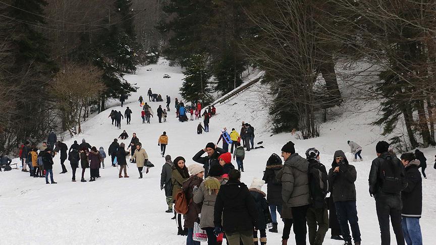 Kar kalınlığının yer yer 30 santimetre olduğu Abant'taki gölün çevresinde yürüyüş yapan ziyaretçiler, Örencik Yaylası'nda köylüler tarafından oluşturulan alanda şambriyellerle ve yanlarında getirdikleri kızaklarla eğleniyor.
