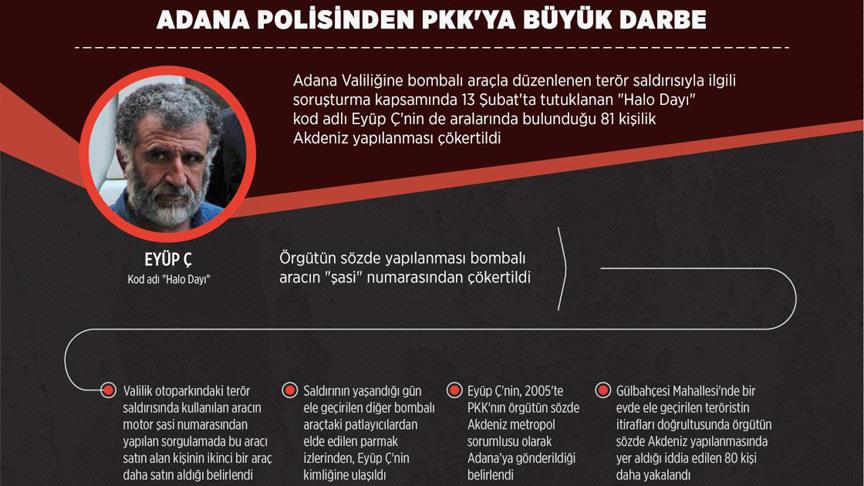 Adana Valiliğine bombalı araçla düzenlenen terör saldırısıyla ilgili soruşturma kapsamında 13 Şubat'ta tutuklanan "Halo Dayı" kod adlı Eyüp Ç'nin de aralarında bulunduğu terör örgütünün 81 kişilik Akdeniz yapılanması çökertildi.