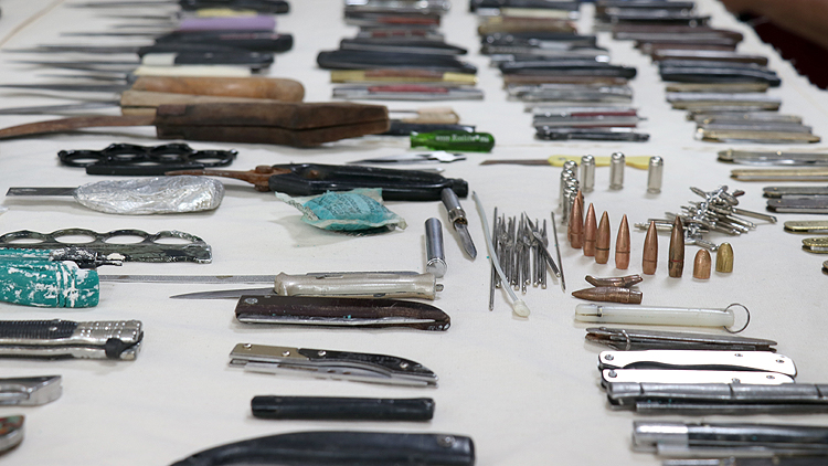 Son bir yıldaki kontrollerde 426'sı bıçak, 152'si makas, 738'i neşter-jilet ve 67'si çeşitli cisimler olmak üzere farklı ebatlarda bin 383 kesici ve delici alet ile 5 biber gazı spreyi ele geçirildi.