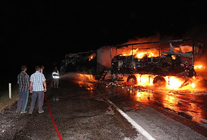 Alınan bilgiye göre, PKK mensubu teröristler Doğubayazıt-Iğdır ve Doğubayazıt-İran karayolunda 3 tırı durdurdu. Sürücüleri araçlardan indiren teröristler, daha sonra benzin dökerek 3 tırı ateşe verdi.