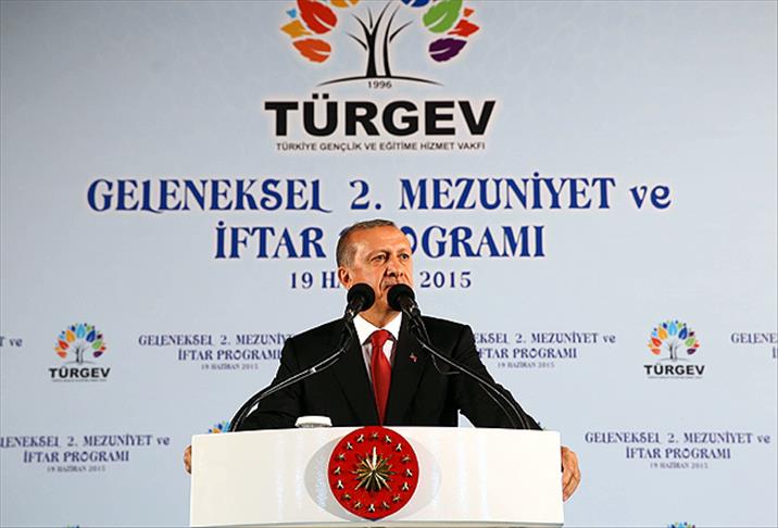 Erdoğan, Okçular Vakfı'nda düzenlenen TÜRGEV'in 2015 Mezuniyet Töreni ve İftar Programı'nda yaptığı konuşmada, eğitime ve gençliğe hizmet yolunda 19. yılına ulaşan vakfa çalışmalarında başarılar diledi.