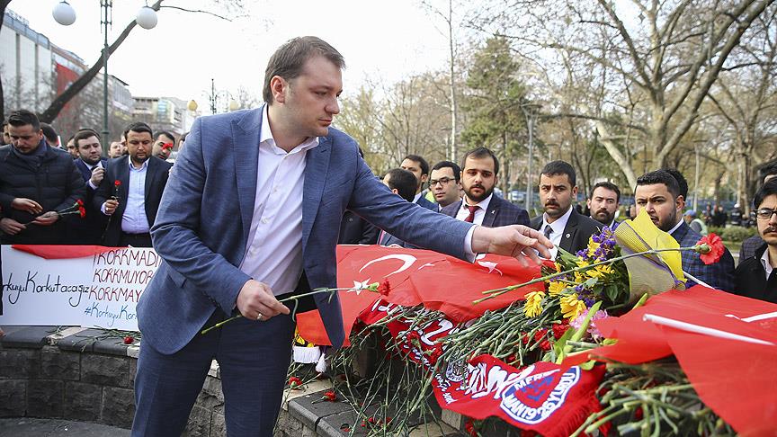 Ecertaş, 81 ilden gelen AK Parti il gençlik kolları başkanları ile Kızılay Güvenpark'ta terör saldırısının gerçekleştirildiği yere karanfil bıraktı.
