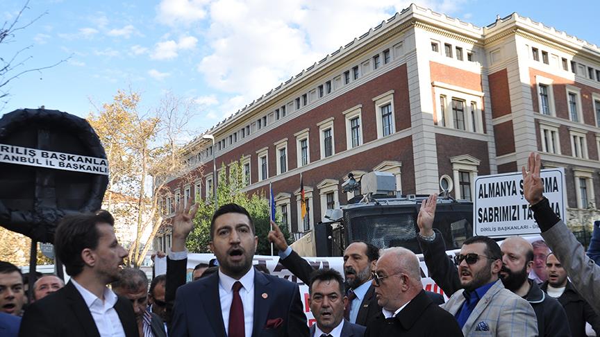 Diriliş Başkanları İstanbul İl Başkanlığı üyeleri, Almanya'nın son zamanlarda Türkiye ile ilgili yaptığı açıklamaları protesto ederek İstanbul Başkonsolosluğu önüne siyah çelenk bıraktı.