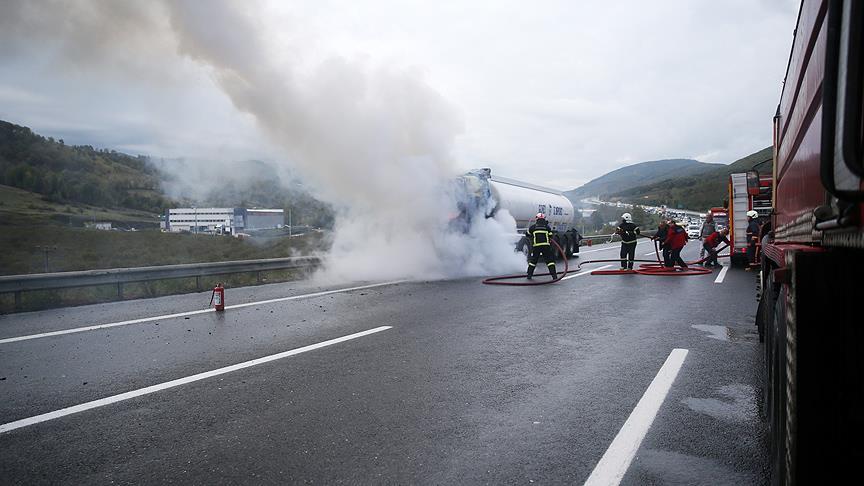 Alınan bilgiye göre, Anadolu Otoyolu'nun otoyolun Sakarya-Düzce sınırı Gümüşova rampaları mevkisinde, Mehmet Kaya (28) idaresindeki 27 DE 651 plakalı bitkisel yağ yüklü tankerin motor kısmında henüz belirlenemeyen nedenle yangın çıktı.