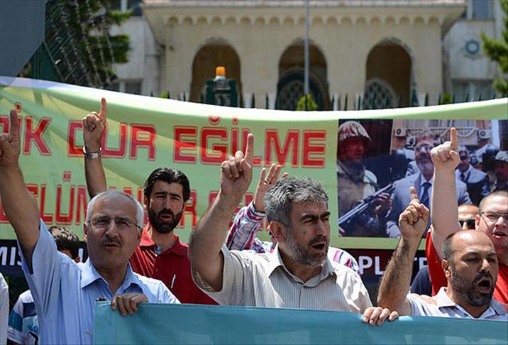 "Paşaların tankı, yıldıramaz halkı", "Diren Mısır, Türkiye seninle", "Mazlumların kanı zalimleri boğacak" ve "Diren Mursi, Müslümanlar seninle" sloganları atan gruptakiler tekbir getirdi.