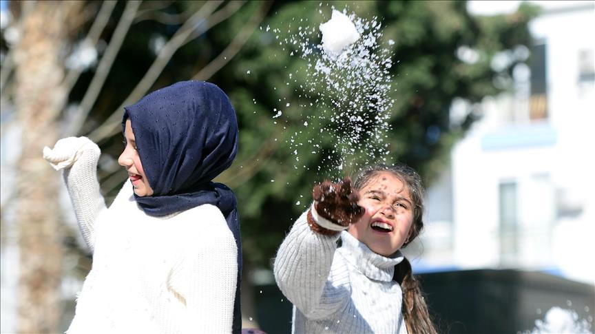 İlk kez kar gördüğünü belirten bazı öğrenciler, hava sıcaklığının 18 derece ölçüldüğü ilçede kar topu oynamanın keyfini çıkardı. Bazı öğrenciler de kardan adam yaptı.