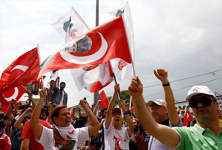 Hükümet ve ABD aleyhine slogan atan gruptakiler, Taksim Gezi Parkı eylemlerine destek için Hatay'da düzenlenen gösteride hayatını kaybeden Abdullah Cömert için saygı duruşunda bulundu ve İstiklal Marşı'nı okudu.