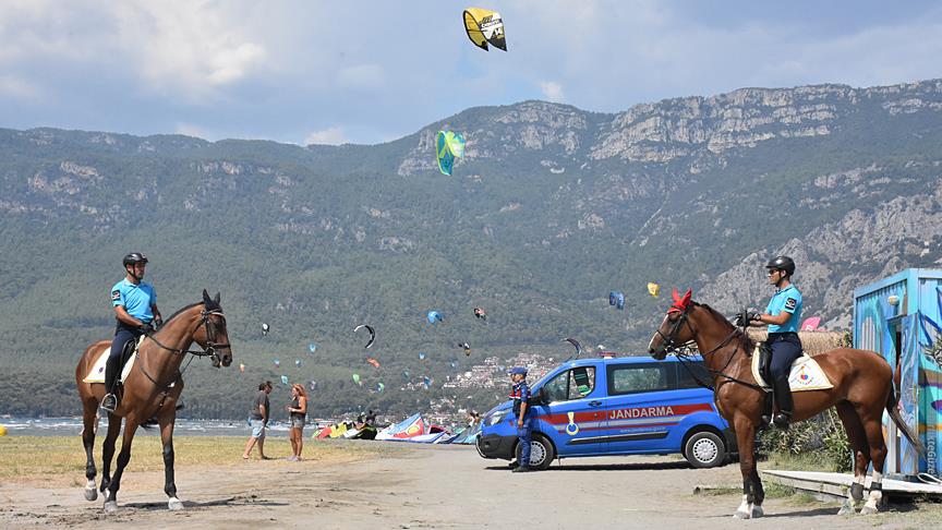 2018 Dünya Kiteboard Ligi Şampiyonası'nın yapıldığı Muğla'nın Ula ilçesindeki Akçapınar sahilinde görev yapan atlı jandarmalar, dünyaca ünlü sporcu ve turistlerin ilgi odağı oldu.