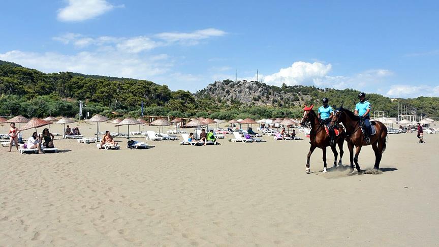 Sarıgerme Jandarma Karakol Komutanlığı bünyesinde oluşturulan geçici at merkezinde kalan atlı jandarmalar, Sarıgerme sahilinde ve plaj içinde devriye gezecek.