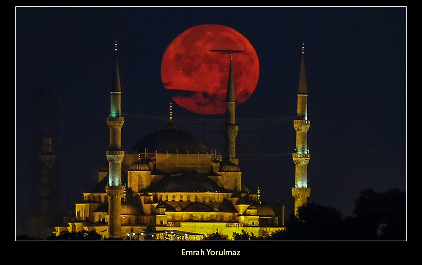 İstanbul'da dolunay -İstanbul'da sabah saatlerinde beliren dolunay, Sultan Ahmet Camisiyle güzel görüntü oluşturdu.